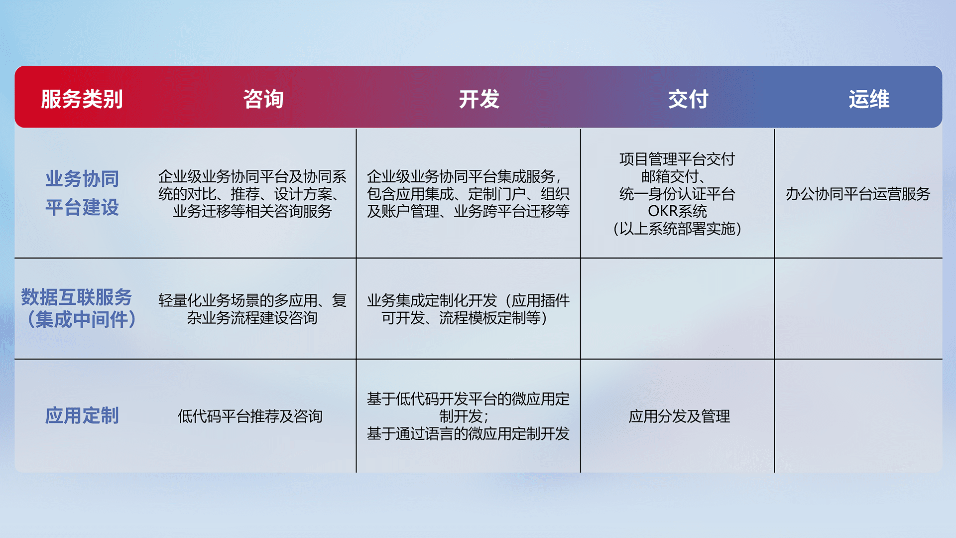 针对钉钉、、、企微、、、、IDaas等平台级产品提供产品的规划、、方案、、交付、、定制化开发等服务,,,实现如统一协同办公、、智能客户服务、、、混合会议管理、、、、智能数据查询、、等业务场景,,,实现数字化转型。。。。